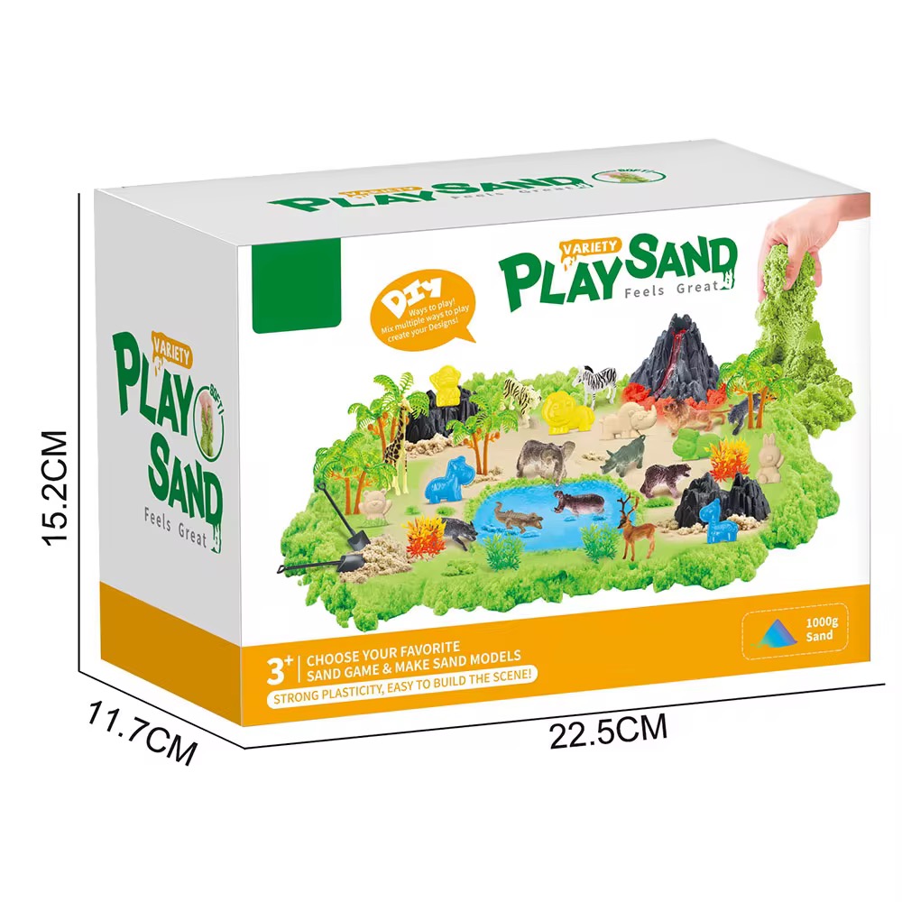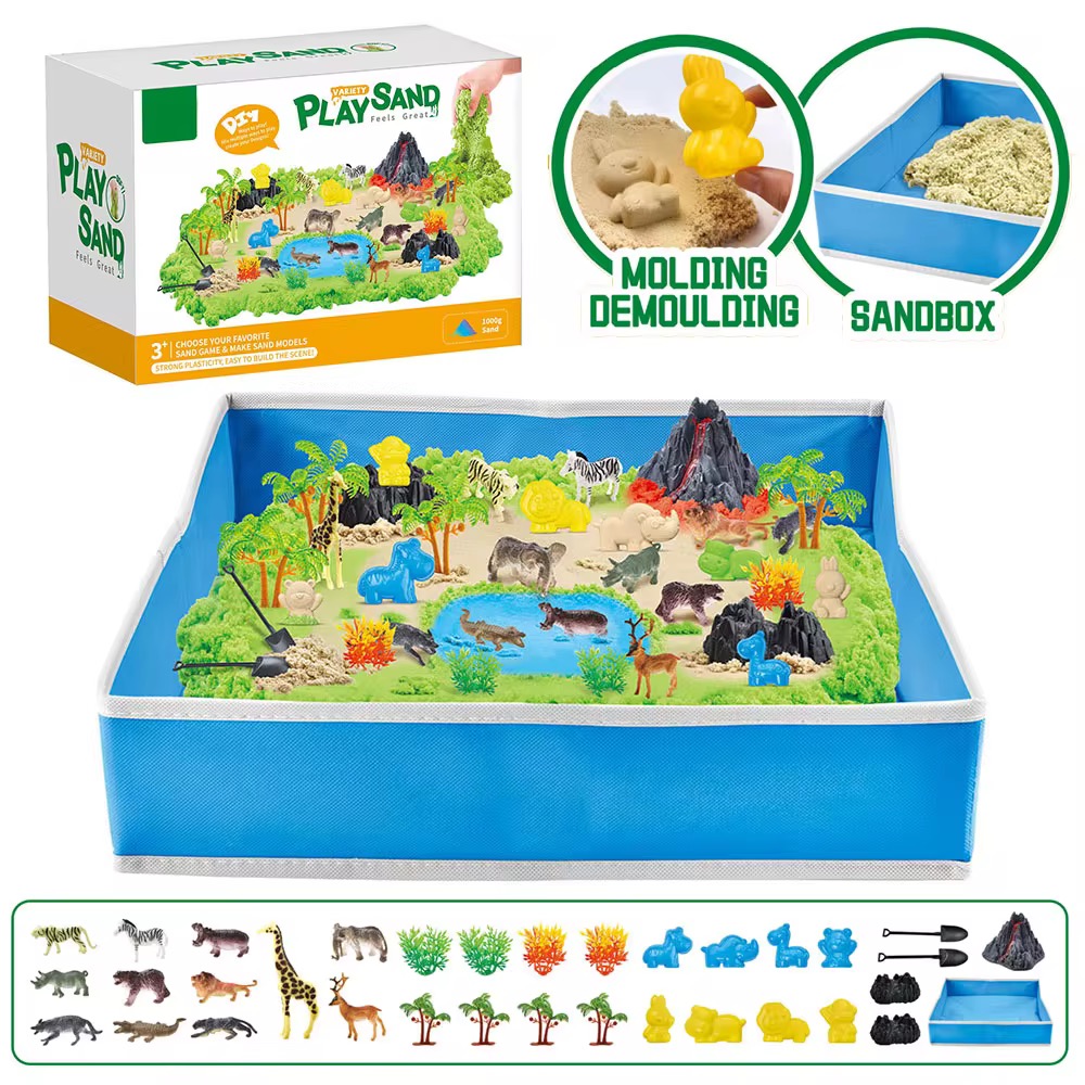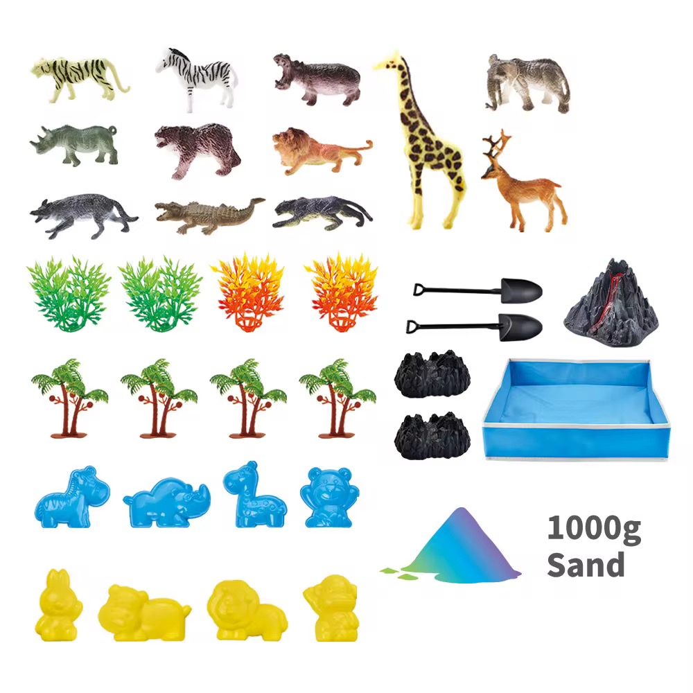 لعبة الرمل التفاعلية تأتي مع حيوانات السفاري، أشجار، أدوات الحفر، وبركان رائع… كل هذا داخل صندوق رمل قابل للطي ليعيش الطفل تجربة لعب خيالية كأنه في غابة حقيقية.
