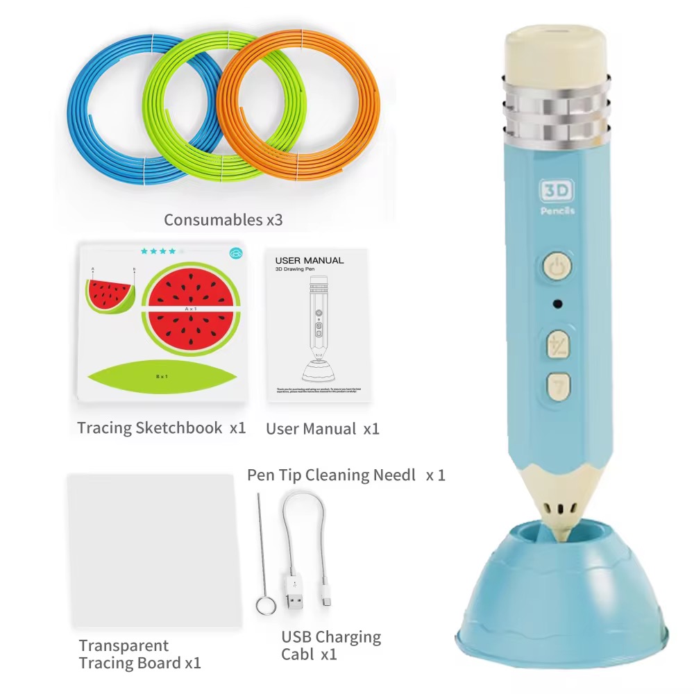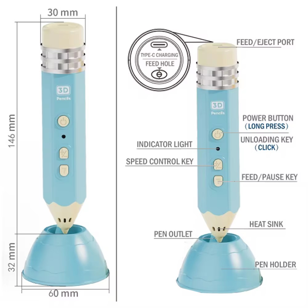 يتميز القلم بسرعة يمكن التحكم بها، وإضاءة مؤشر، وأزرار واضحة للتشغيل والإيقاف والتغذية. كما يأتي مع قاعدة مخصّصة لوضع القلم بشكل آمن بعد الاستخدام. مناسب للأطفال والهواة وكل من يحب عالم الابتكار.