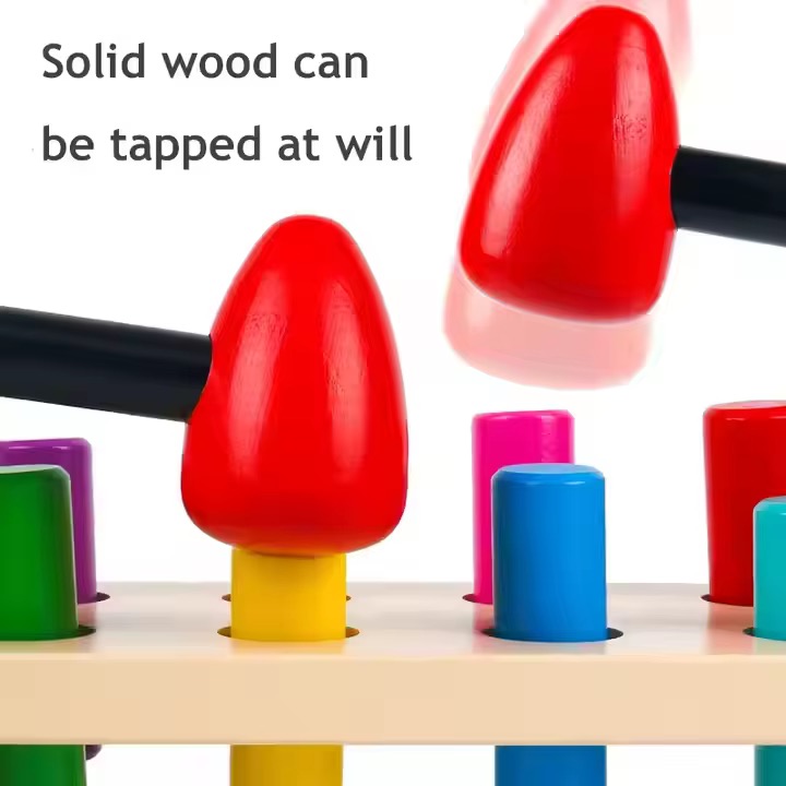 لعبة الطرق الخشبية الممتعة، يقوم الطفل بضرب القطع الملونة بالمطرقة لتسقط إلى الأسفل، ثم يقلب اللعبة ويبدأ من جديد ليستمر اللعب والحماس مرة أخرى.