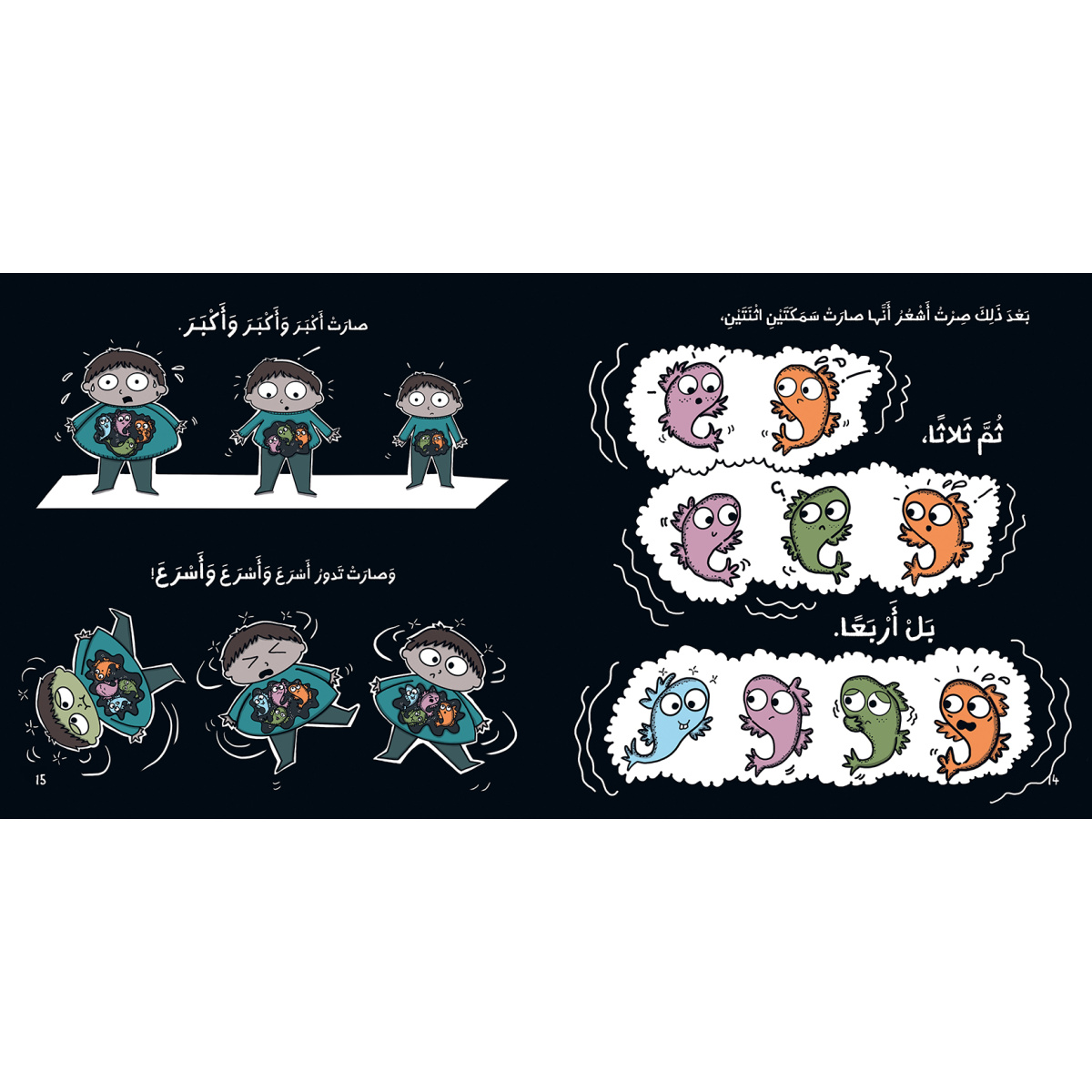 يشعر الطفل الصغير في هذه القصة بالقلق من سمكة تدور في معدته. ومع الوقت تصبح هذه السمكة سمكتين، أو ثلاثة أو أربعة! يحاول قصارى جهده ليتخلص منها لكنها تصبح أكبر وأكثر، وينتهي به الأمر بالفشل.يطلب الطفل الصغير المساعدة، فيسأل والده وجدته وصديقه رضوان، لكن لم يعطه أحد منهم حلًا مناسبًا للسمكة الدوارة.فيذهب إلى والدته التي تستمع إلى مشكلته باهتمام وتأخذه إلى الطبيب.تسلط القصة الضوء على مشاعر القلق عند الأطفال وكيف تؤثر على سلوكهم وحياتهم اليومية وتجعلهم يغرقون في النقد الذاتي والمشاعر السلبية، وتقترح حلولا لهذه المشكلة كي تدفع الطفل إلى التخلي عن قلقه بالتدريج كي يتفاعل مع محيطه ويصبح أكثر سعادة ومساعدة للآخرين.للمناقشة: