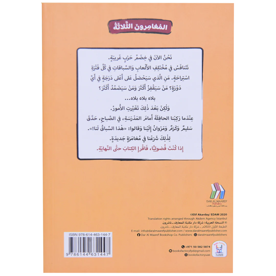 عِنْدَمَا رَكِبْنا الحافِلَةَ أَمَامَ المَدْرَسَةِ، فِي الصَّبَاحِ، حَدَّقَ سلِيمٌ وَكَرَمْ وَمَرْوانُ إِلَيْنَا وَقَالوا: «هذا السِّباقُ لَنا!». لِذلِكَ شَرَعْنا فِي مُعَامَرَةٍ جَدِيدَةٍ. إذا كُنْتَ فُضولِيًّا، فَاقْر الكِتابَ حَتَّى النَّهَايَةِ.