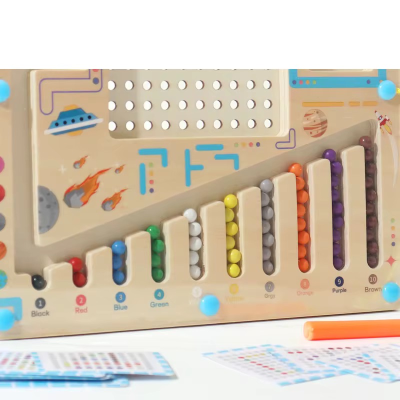 ٢. يوجد مسارات لكل لون ، يحاول الطفل وضع كل لون في مساره الصحيح و من خلال هذه اللعبة يتعلم الالوان و العد