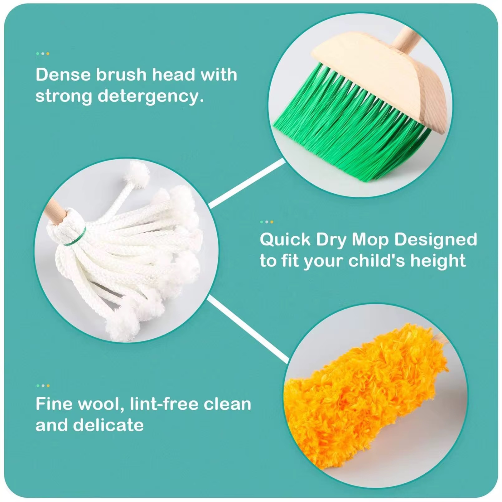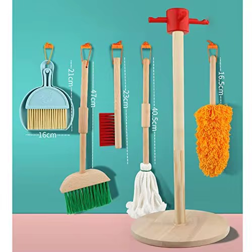 تحتوي المجموعة على أدوات تنظيف صغيرة تناسب أيدي الأطفال مثل المكنسة، الممسحة، الفرشاة، ومجرود صغير مع قاعدة لتخزينها بشكل منظم.