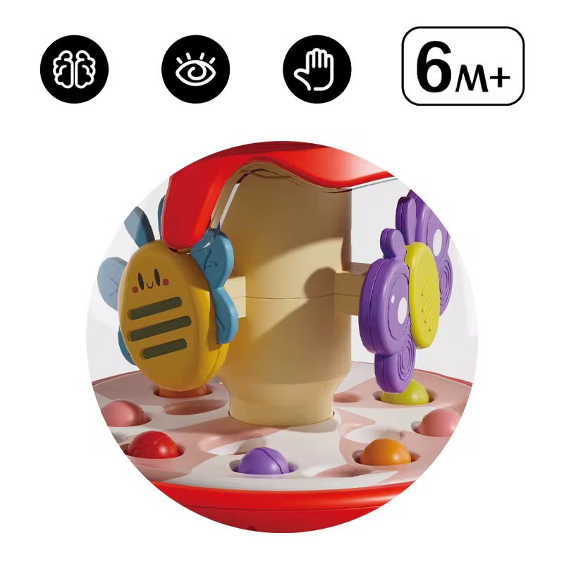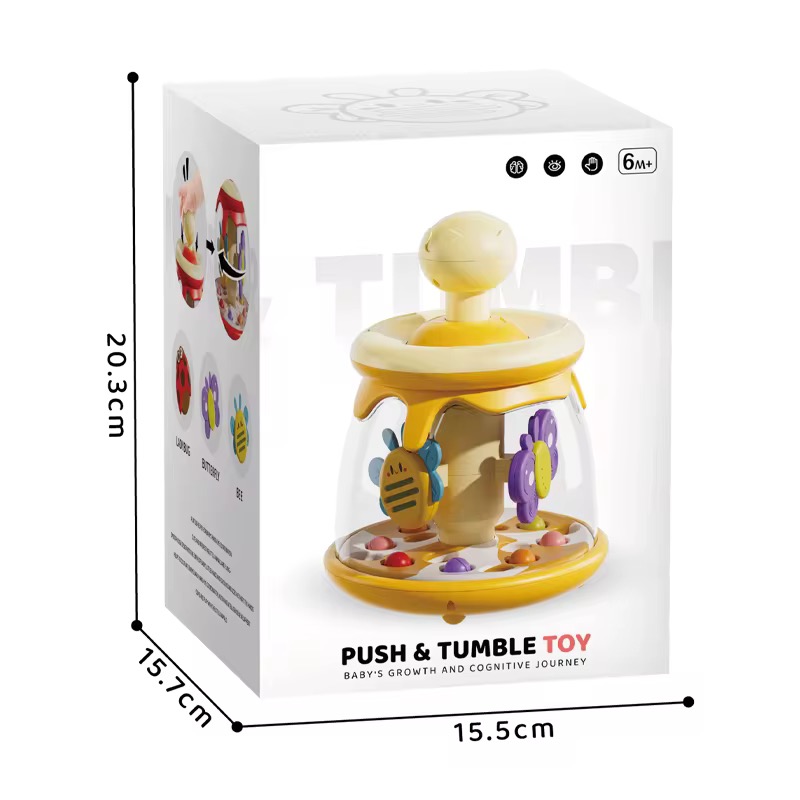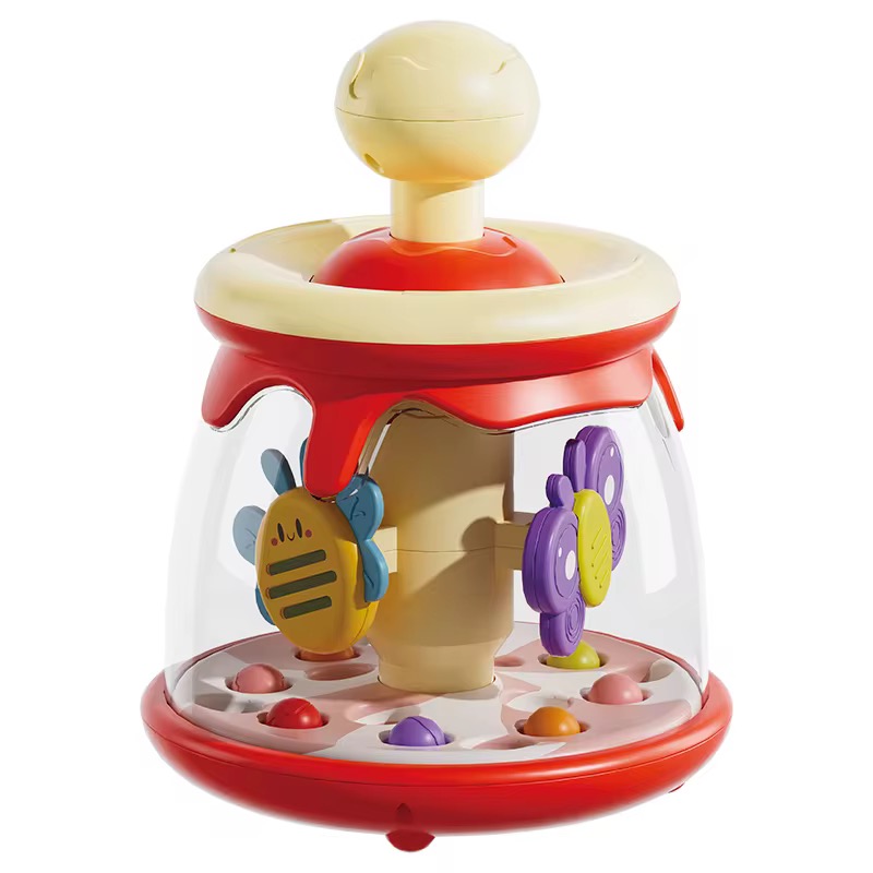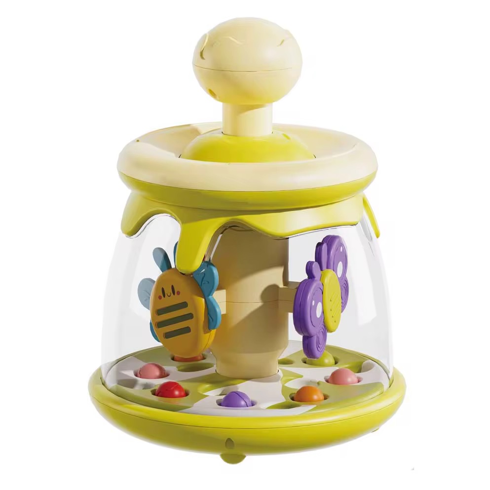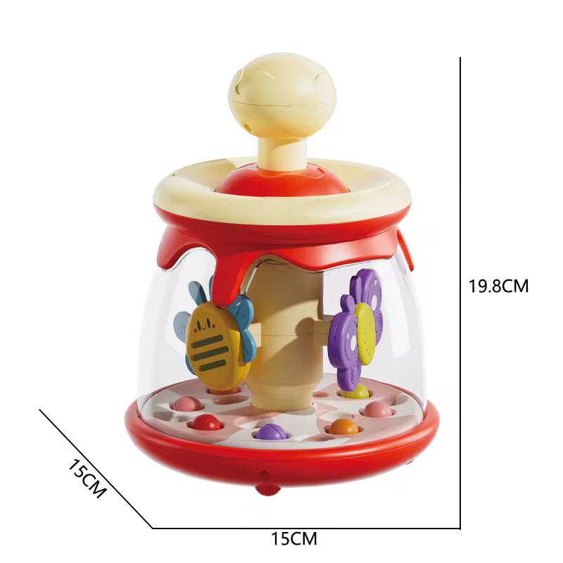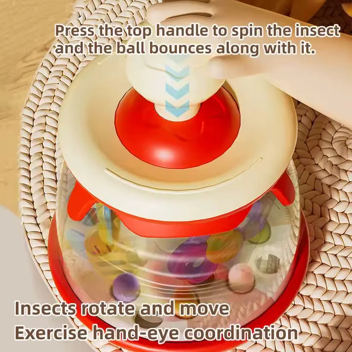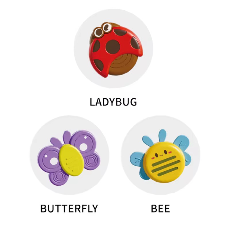 عند الضغط على الجزء العلوي، تبدأ الحيوانات الصغيرة (النحلة 🐝، الفراشة 🦋، الدعسوقة 🐞) بالدوران داخل القبة الشفافة بطريقة ممتعة تشد انتباه الطفل وتشجّعه على الاستكشاف.