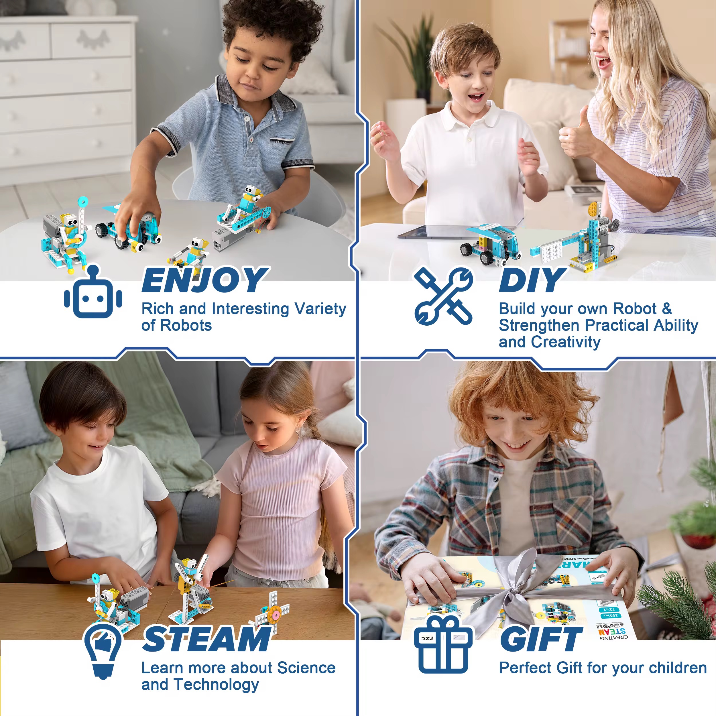 • 🧩 تحتوي على 300 قطعة تركيب عالية الجودة يمكن من خلالها بناء 72 نموذجًا مختلفًا من الروبوتات والآلات المتحركة.